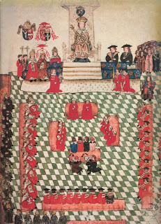 1. Henry VIII, still Catholic, opening Parliamant. Note the Lord Chancellor, Cardinal Wolsey, sitting next to Archbishop Wareham, with a red hat floating over his head. The abbots, sitting behind the bishops on the spiritual side, are wearing cowls and precious mitres. The bishops are wearing parliamentary mantles, which C of E bishops still wear at the state opening.
