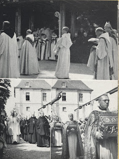 8. At the top, the abbot is bearing a relic of St. Wandrille, the founder of the monastery, prior to Vespers the evening before. Just to the right of the assistant priest, the four cantors in copes. The precentor's staff can be seen in the middle. Bottom left, abbots arrives for Mass; Bottom right, relics of our saints carried in the procession.